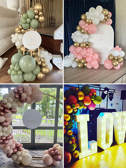 Our professional and talented balloon artists will create beautiful, personalised designs including arches, hoops, half hoops, easels, columns and garlands to match your colour and themes.